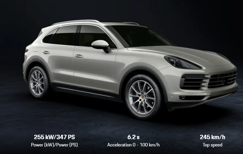 카이엔 일반 suv 모델입니다. 347마력으로 제로백의 경우 6.2초입니다.
