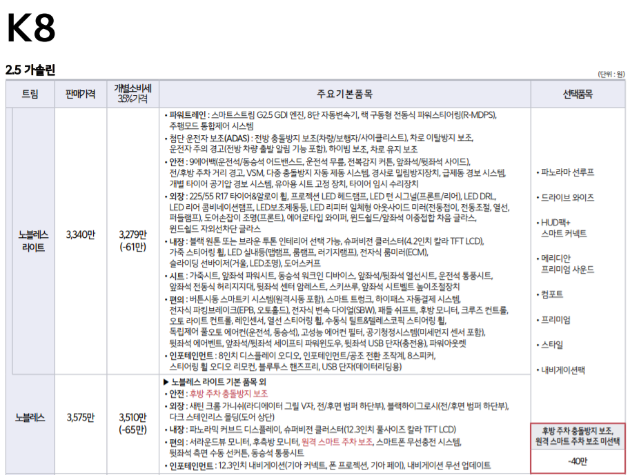 k8 2.5 가솔린 노블레스는 노블레스 라이트 구성 품목을 모두 포함하고 이외 다음의 옵션이 추가됩니다.