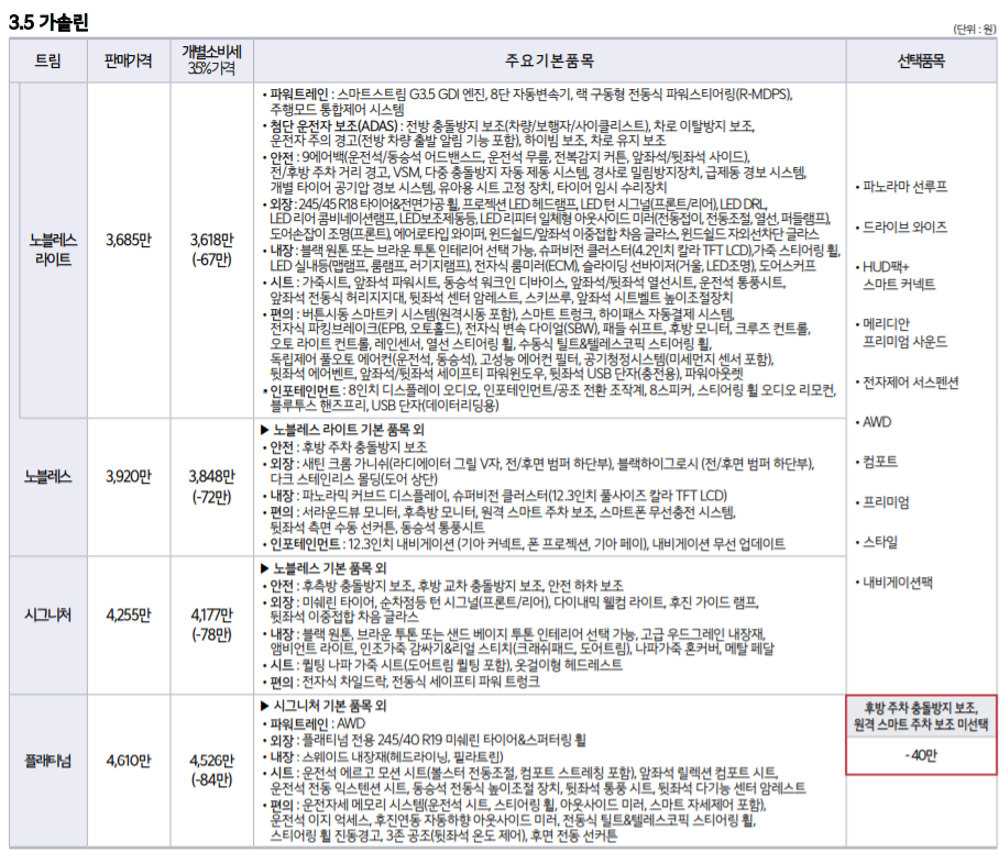 3,685만 원부터 시작하여 4,610만 원 까지 다양한 가격, 옵션으로 구성되어 있습니다.