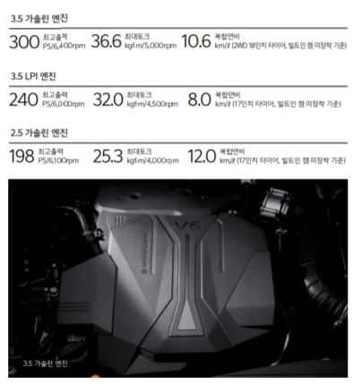 2.5 가솔린 엔진의 경우 198마력, 12.0km/l연비