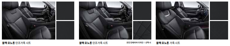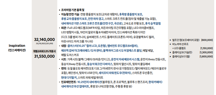 - 인스퍼레이션 특화된 디자인(다크 크롬 범퍼 가니쉬, 유광 블랙, b, c 필러, 아웃사이드 미러 크롬 가니쉬)