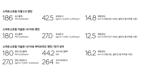 - 1.6 가솔린 터보 엔진/ 2.0 디젤 엔진