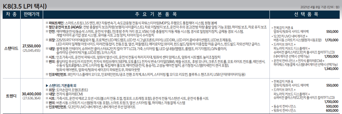 k8 택시는 스탠다드, 트렌디로 2가지 트림으로 나누어져 있습니다.