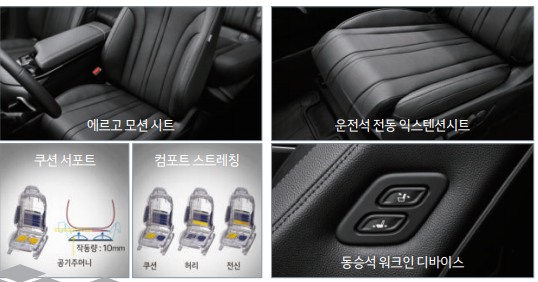 에르고 모션 시트, 운전석 전동 익스텐션 시트, 쿠션 서포트, 동승석 워크인 디바이스 등의 기능이 포함되었습니다.