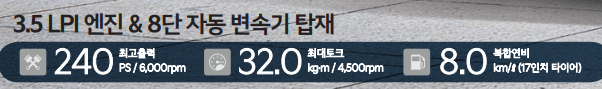 8.0km/l 연비는 다소 아쉬워 보이지만, 차급과 3500cc 엔진을 생각하면 충분히 이해가 되는 부분입니다.