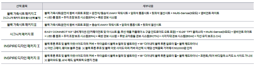 시그니처 패키지와 블랙 가죽 시트 패키지는 선택하여야 할 옵션으로 보입니다.