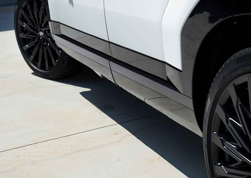 싼타페 블랙잉크 휠도 블랙잉크 전용 휠이 장착됩니다. 21인치 알로이 휠이 장착되며 감싸고 있는 도어 가니쉬도 매트 블랙 메탈이 적용됩니다.