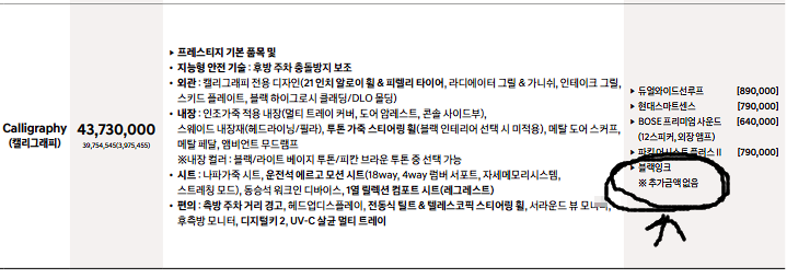 싼타페 블랙잉크는 캘리그래피 등급에서 추가금 없이 선택이 가능합니다.