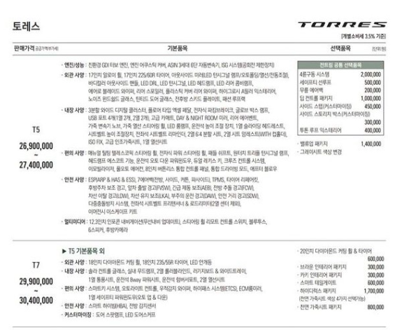 토레스는 T5와 T7 등급으로 나누어 판매될 예정입니다.