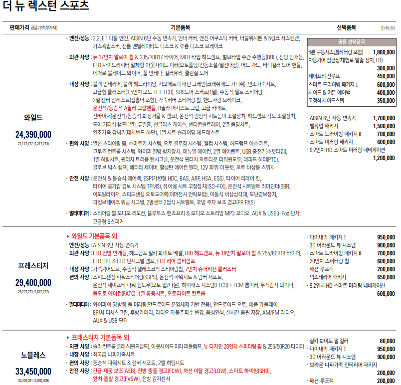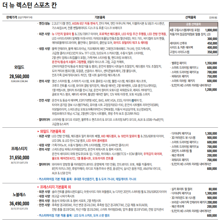 렉스턴 스포츠 칸 트림 별 옵션, 가격