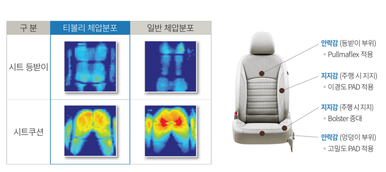 시트에서도 체압 분포를 적용하여, 운전자에게 보다 편안한 착좌감을 제공하고 있습니다.