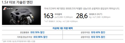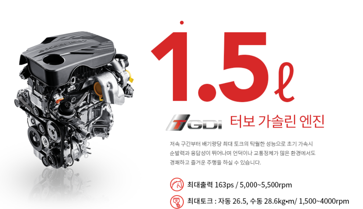 •엔진/성능 : 1.5ℓ 터보 가솔린 엔진, 6단 수동변속기 + 드라이브 모드 시스템,