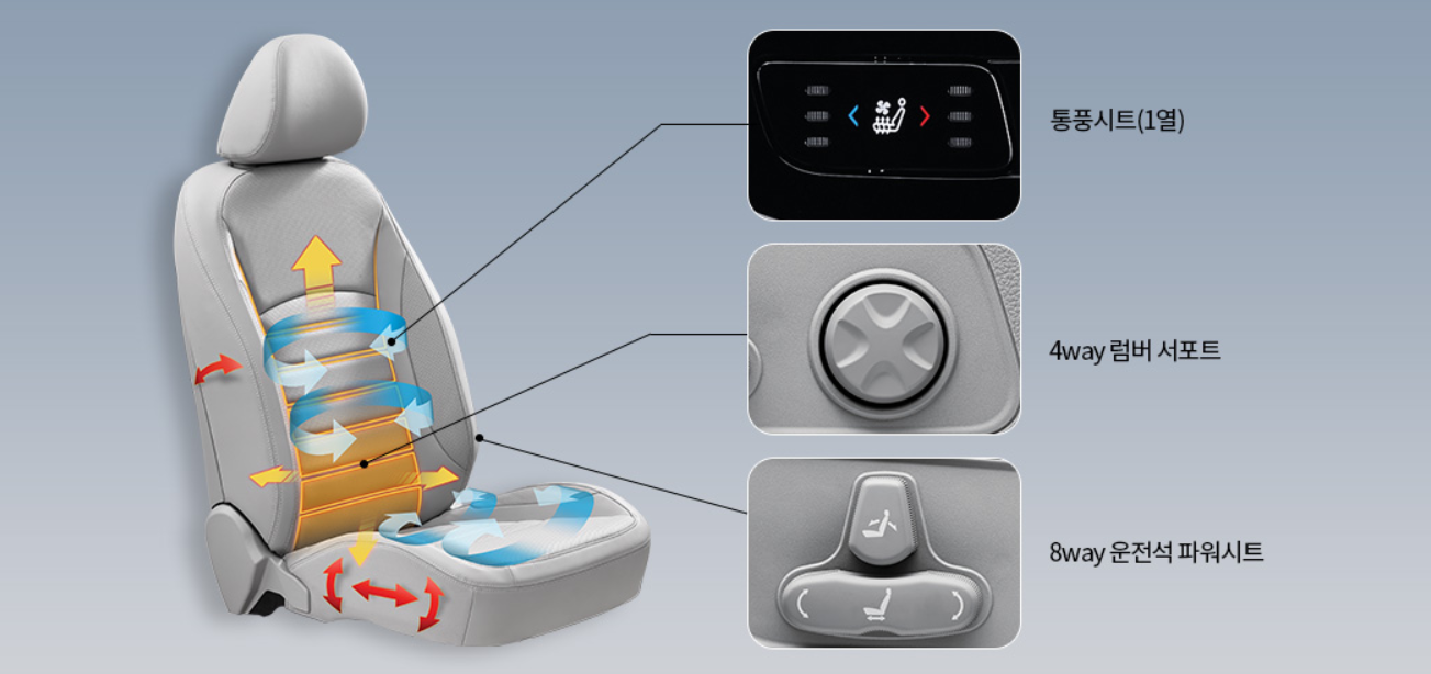 •편의 사양 : 운전석 8way 파워시트 & 운전석 4way 럼버서포트, 1열 통풍시트, 듀얼존 풀오토 에어컨