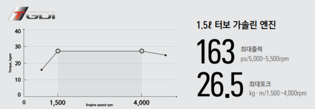 •엔진/성능 : 1.5ℓ 터보 가솔린 엔진, AISIN 6단 자동변속기 + 부츠타입 기어노브, ISG 시스템, 드라이브 모드 시스템,
