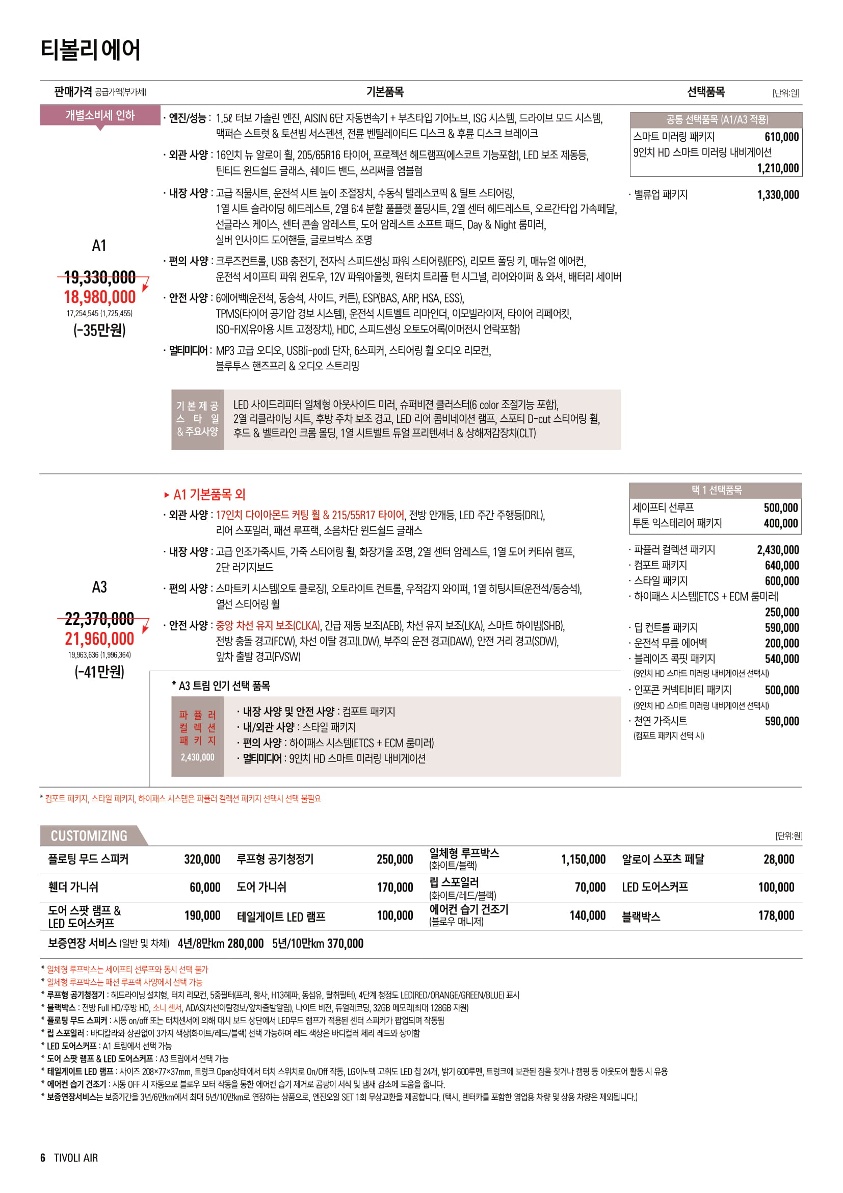 2021 티볼리 에어 옵션, 가격