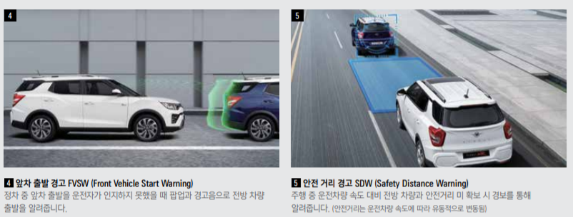 전방 충돌 경고(FCW), 차선 이탈 경고(LDW), 부주의 운전 경고(DAW), 안전 거리 경고(SDW), 앞차 출발 경고(FVSW)