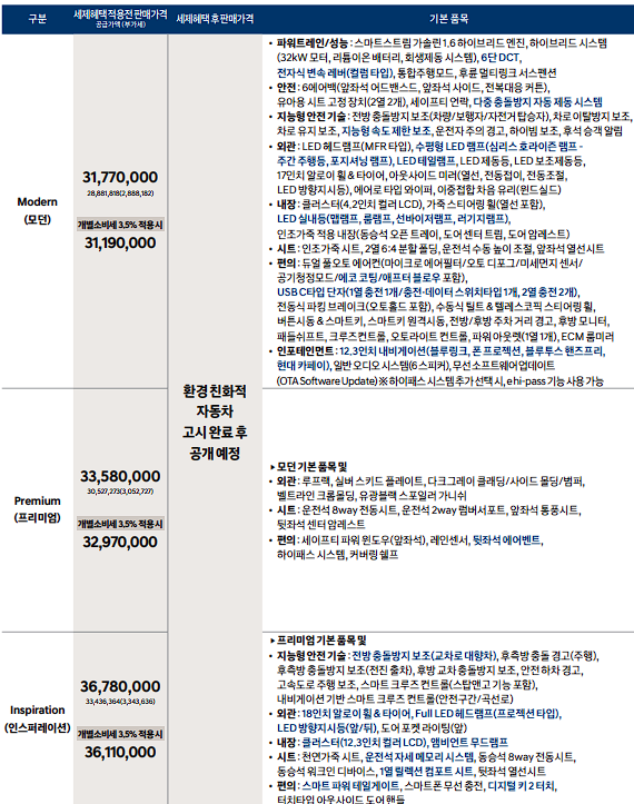 신형 코나 하이브리드 차량은 모던, 프리미엄, 인스퍼레이션 트림으로 나누어 판매 중입니다.