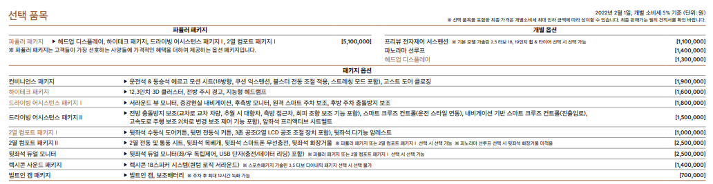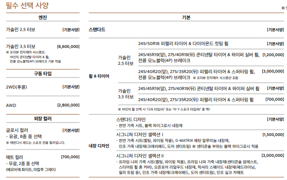각 엔진별 단일 트림이 존재하며, 원하는 옵션이나 사양을 추가하여 구매하는 방식입니다.