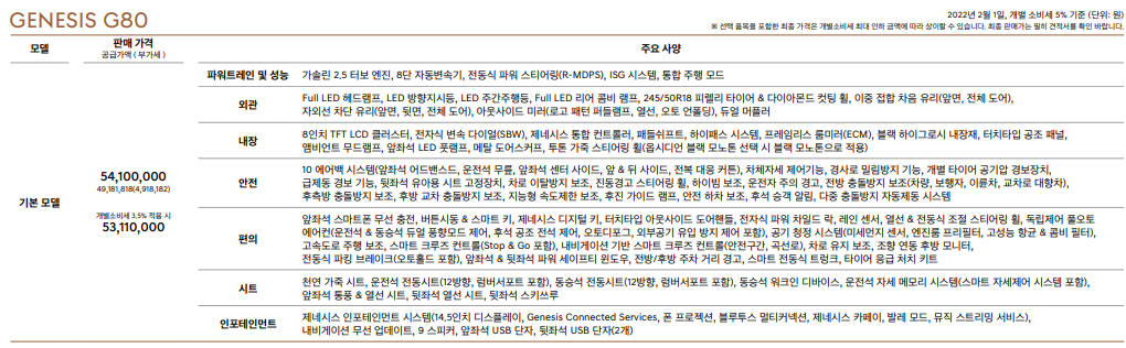 5천만 원부터 시작하여 여러 가지 편의사양을 제공하는 g80입니다.