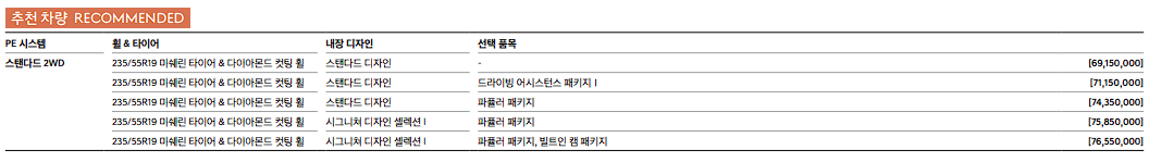 스탠더드 2wd 최고 출력 : 168kw