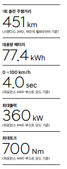 비슷하게 출시된 현대, 기아의 전기차 아이오닉, ev6와 비교했을 때는 비슷하거나 조금 뒤쳐지는 정도로