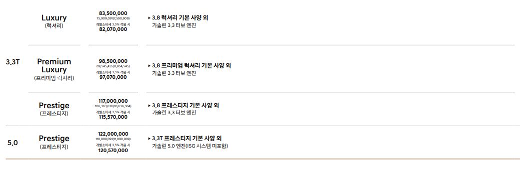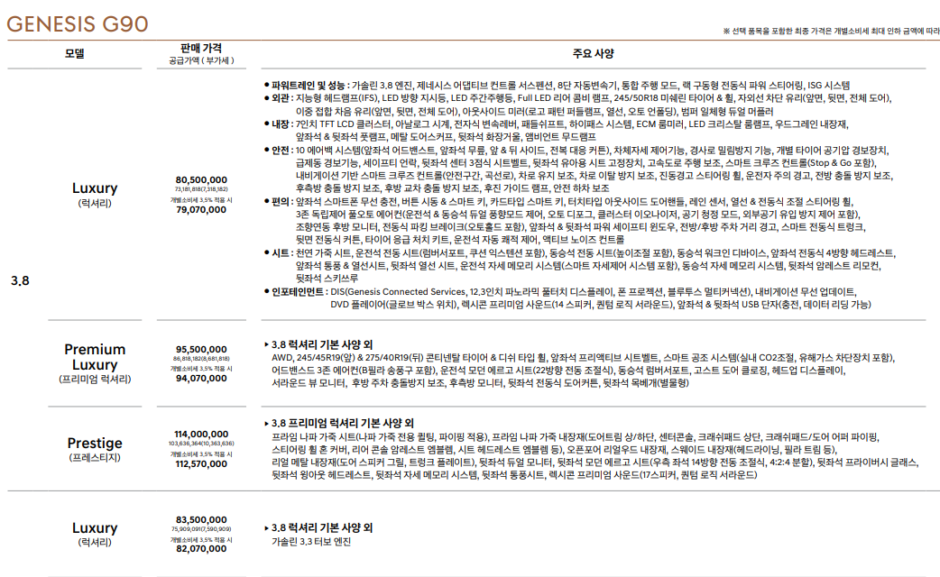 기존 제네시스 g90은 3.8가 솔린 엔진, 3.3 가솔린 터보 엔진, 5.0 가솔린 엔진으로 판매 중입니다.