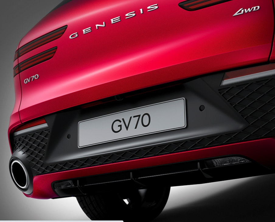 두 줄의 얇은 쿼드램프를 적용하였으며 모든 기능적 요소를 범퍼 하단에 배치시켜 심플하고 순수한 이미지를 완성시켰습니다. 또한, 지-매트릭스(G-Matrix) 패턴을 적용한 범퍼와 세로형 머플러로 GV70만의 독특한 스타일을 강조하였습니다.