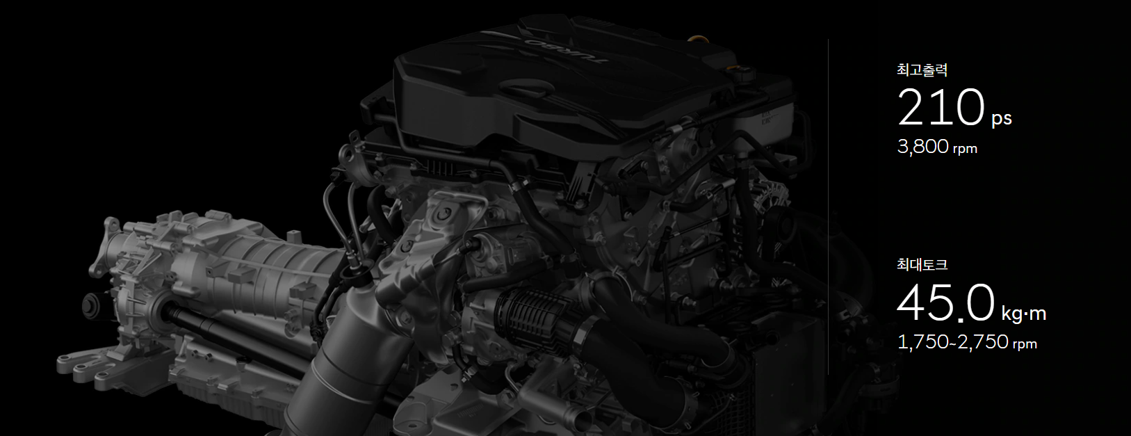 기본 성능과 경제성을 겸비한 가솔린 터보 엔진입니다. 차량 운전 조건에 맞게 최적으로 연료를분사하는 듀얼 인젝션 시스템을 적용하고, 냉각수 흐름 및 온도를 제어하여 노킹 성능 향상 및 마찰 손실을 저감하는 가변 분리 냉각 시스템을 적용하였습니다.
