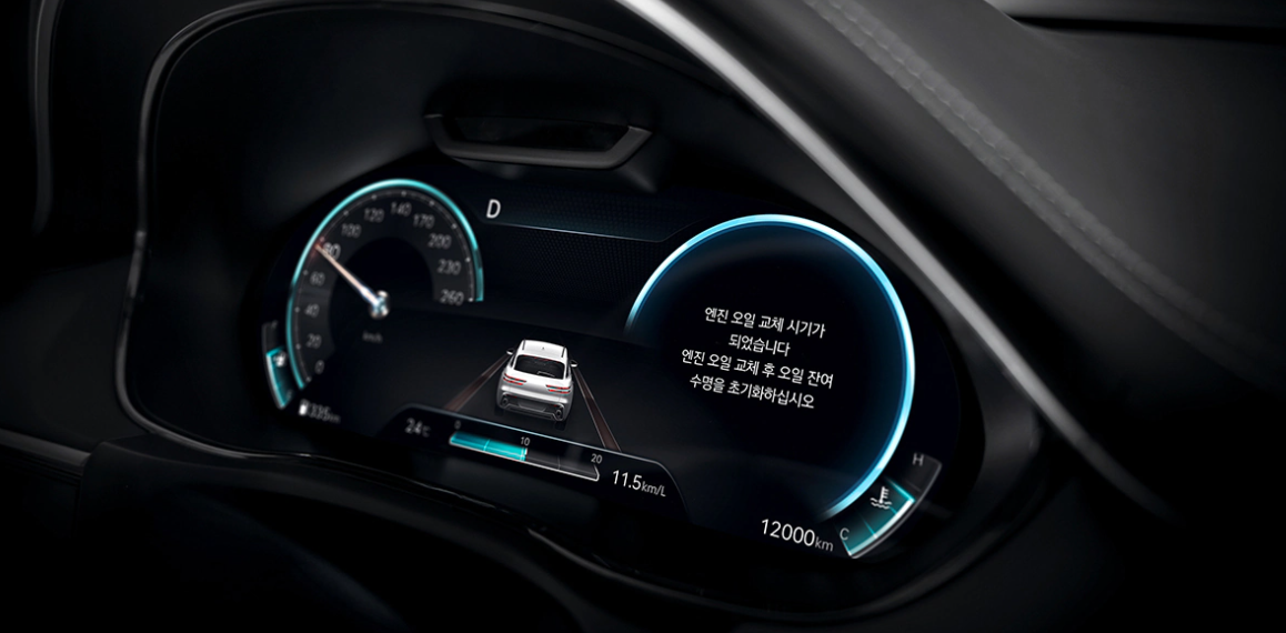 운전자의 주행 패턴에 따라 엔진오일 교체 주기는 다르며, GV70는 고객의 엔진 데이터를 활용하여 엔진오일 수명을 자동으로 계산, 필요한 시점에 엔진오일을 교환할 수 있는 알림 서비스를 제공합니다.