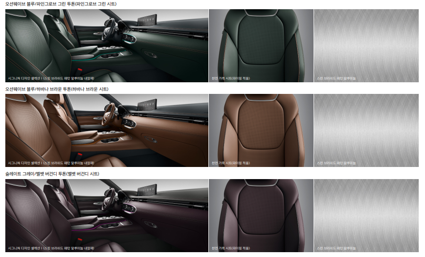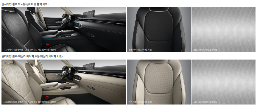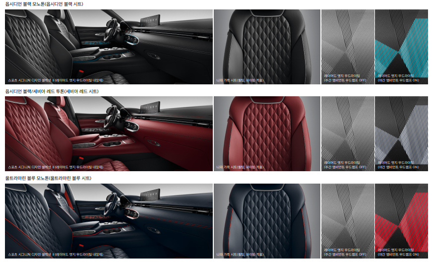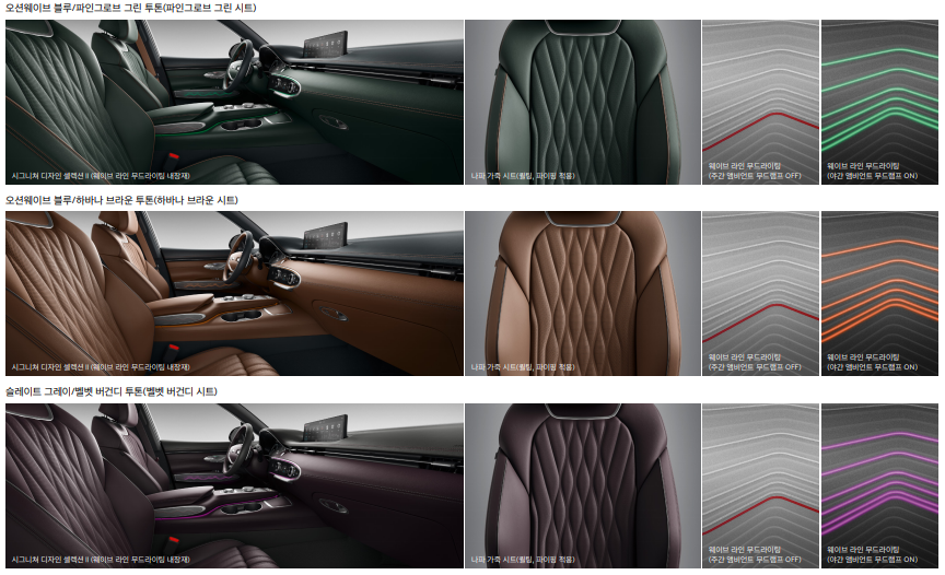 - 프라임 나파 가죽 시트(퀼팅, 파이핑 적용), 웨이브 라인 무드 라이팅 내장재, 인조 가죽 내장재(크래쉬패드, 도어트림 상단, 콘솔 가니쉬, 리어 에어벤트 베젤 부 등), 럭셔리 스웨이드 내장재(헤드라이닝, 필라트림 등), 투톤 가죽 스티어링 휠 [3,000,000]