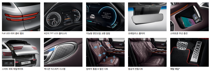 앞좌석 스마트폰 무선 충전 적용, 버튼시동 & 스마트 키, 제네시스 디지털 키, 터치 타입 아웃사이드 도어 핸들, 전자식 파워 차일드 락, 레인 센서, 열선 & 전동식 조절 스티어링 휠, 실내 지문 인증 시스템(개인화, 시동, 결제 등), 독립제어 풀오 에어컨(운전석 & 동승석 듀얼 온도 제어, 후석 공조 전석 제어 적용, 오토 디포그, 외부 공기 유입 방지 제어, 애프터 블로우 포함), 공기 청정 시스템(미세먼지 센서, 엔진룸 프리필터, 고성능 항균 & 콤비 필터), 조향 연동 후방 모니터, 전동식 파킹 브레이크(오토 홀드 포함), 앞좌석 & 뒷좌석 파워 세이프티 윈도, 전방/후방 주차 거리 경고 적용, 스마트 파워 테일게이트, 타이어 응급 처치 키트, 지능형 엔진오일 교환 알림 시트 인조 가죽 시트, 운전석 전동시트(12방향, 럼버 서포트 포함), 동승석 전동시트(8방향, 높이 조절 포함), 동승석 워크인 디바이스, 운전석 자세 메모리 시스템(스마트 자세 제어 시스템 포함), 앞좌석 통풍 & 열선 시트 적용, 뒷좌석 열선 시트, 뒷좌석 수동 리클라이닝, 뒷좌석 6:4 폴딩 인포테인먼트 제네시스 인포테인먼트 시스템(14.5인치 디스플레이, Genesis Connected Services, 폰 프로젝션, 도로파손/미끄럼 지역 알림, 블루투스 멀티커넥션 적용, 제네시스 카페이, 발레 모드, 뮤직 스트리밍 서비스), 내비게이션 무선 업데이트, 9 스피커, 앞좌석 & 뒷좌석 USB 단자를 적용하여 편의사항의 경우에도 프리미엄 브랜드답게 기본 모델에서도 풍부한 옵션을 제공하고 있어 구매자들에게 만족을 줄 것 같습니다.
