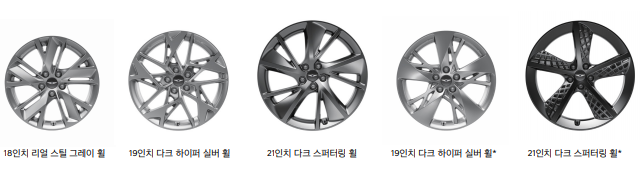 gv70 휠의 경우 위 사진을 참고하시게 되면 이해가 더 잘 되실 겁니다. 개인적으로는 21인치 다크 스퍼터링 휠이 가장 예쁜 것 같습니다.