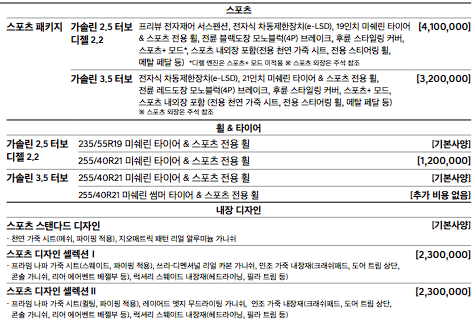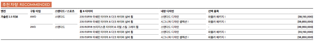 2.5 가솔린 터보 엔진과 3.5 가솔린 터보 엔진의 라인업은 최대 출력이 각각 304마력과 375마력이며, 8단 자동변속기 시스템이 장착되어 있습니다.