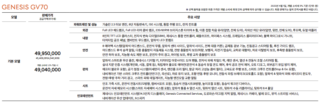제네시스 gv70 구매를 위한 가격표, 카탈로그 정보