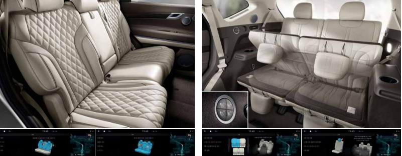 천연 가죽 시트, 운전석 전동시트(12방향, 럼버 서포트 포함), 동승석 전동시트(12방향, 럼버 서포트 포함), 동승석 워크인 디바이스, 운전석 자세 메모리 시스템(스마트 자세 제어 시스템 포함), 앞좌석 통풍 & 열선 시트,
