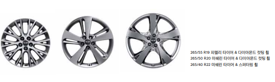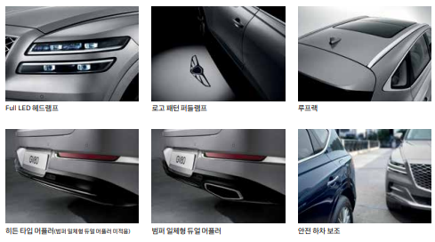 Full LED 헤드램프, LED 방향지시등, LED 주간 주행 등, Full LED 리어 콤비 램프, 265/55 R19 피렐리 타이어 & 다이아몬드 컷팅 휠, 이중 접합 차음 유리(앞면, 전체 도어), 자외선 차단 유리(앞면, 뒷면, 전체 도어),