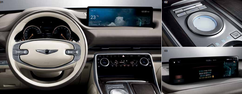 제네시스 인포테인먼트 시스템(14.5인치 디스플레이, Genesis Connected Services, 폰 프로젝션, 블루투스 멀티커넥션, 제네시스 카페이, 발레 모드, 뮤직 스트리밍 서비스), 내비게이션 무선 업데이트, 9 스피커,