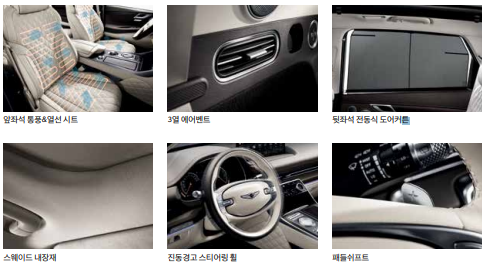 2열 전동, 통풍시트, 3열 전동 폴딩 시트, 앞좌석 에르고 모션 시트 등은 운전석뿐만 아니라 동승석, 2열, 3열 전좌석에 편의사양을 제공하며 gv80이 suv 플래그십 모델임을 다시 한번 확인시켜주고 있습니다.