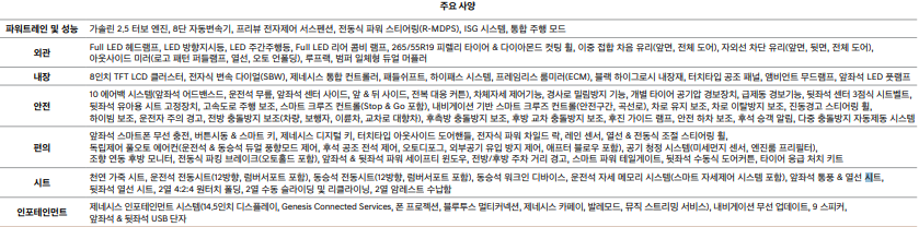 8인치 TFT LCD 클러스터, 전자식 변속 다이얼(SBW), 제네시스 통합 컨트롤러, 패들 쉬프트, 하이패스 시스템, 프레임리스 룸미러(ECM), 블랙 하이그로시 내장재, 터치 타입 공조 패널, 앰비언트 무드 램프, 앞좌석 LED 풋램프