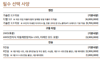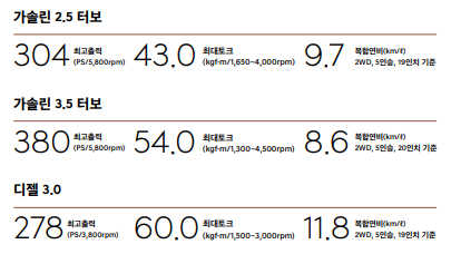 2.5 가솔린 터보, 3.5 가솔린 터보, 3.0 디젤 엔진으로