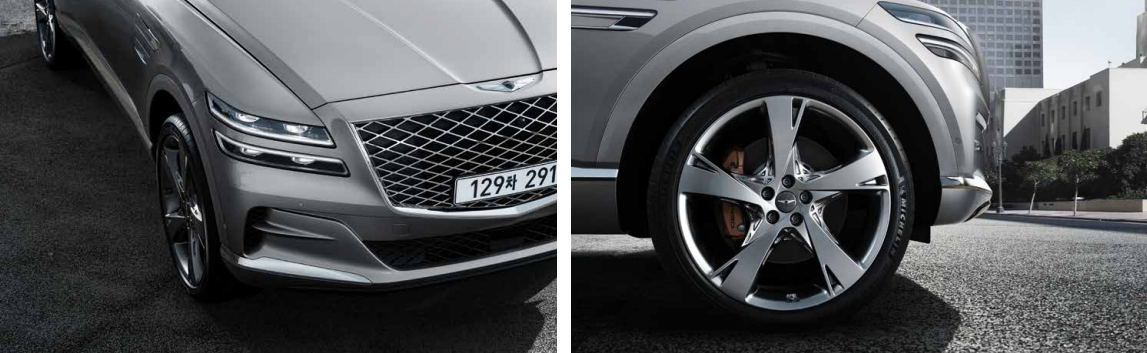 22인치 휠, 타이어는 gv80이 대형 suv임에 확실한 이미지를 주도록 스포티하면서도 고급스러운 이미지를 제공합니다.