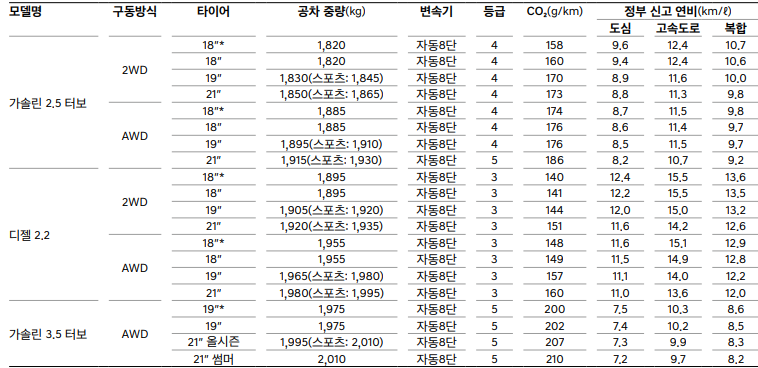 제네시스 gv70 할부 구매 시 복합 연비는 연료에 따라서 달라집니다.