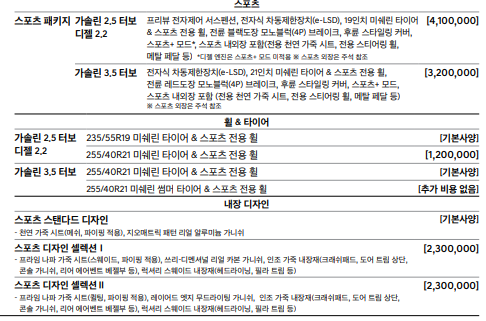 스포츠 스탠더드 디자인, 스포츠 디자인 셀렉션 등의 옵션을 추가하여 실내 마감의 고급감을 높여주고 있습니다.