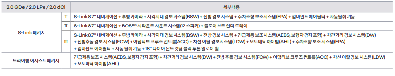 트림별 사양은 가솔린 모델과 동일하니 qm6 가솔린 사양을 참조하시면 됩니다.