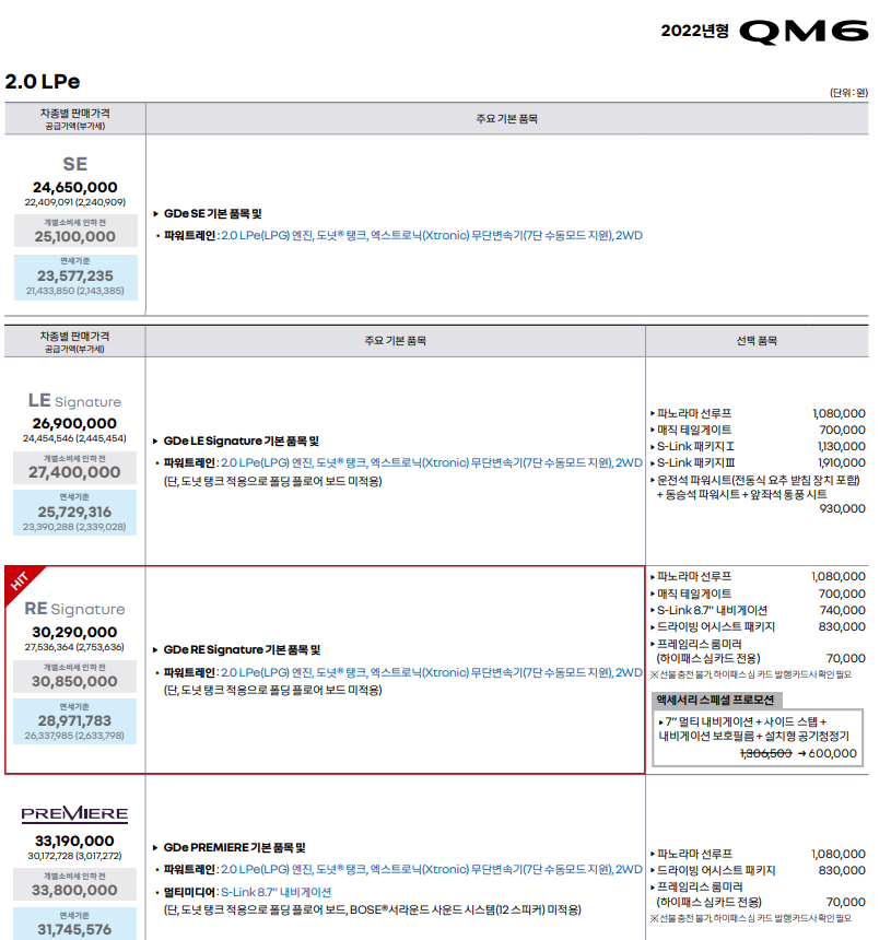 qm6 디젤 모델은 최상위 트림인 premiere만 판매 중입니다.