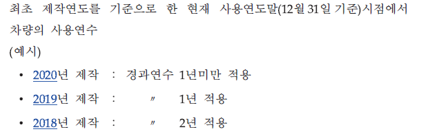 또한 2019년 초에 제작되어 비록 지금 만 1년이 넘은 경우는 현재 2020년 기준으로 2019년 즉, 전년도에 제작되었기에 사용연수는 1년 적용을 받게 되는 것입니다.