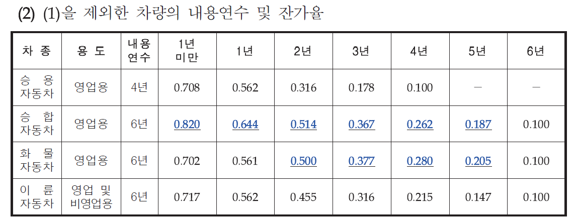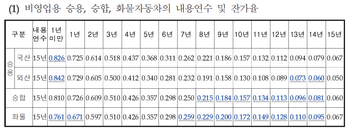그럼 이러한 표준 잔가율은 어떻게 정해지는지 정부에서 제공하는 표를 보며 살펴보도록 하겠습니다.