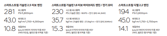 싼타페 하이브리드 시스템 최대 토크는 35.7이며, 15.3km/l 복합 연비를 보여줍니다.