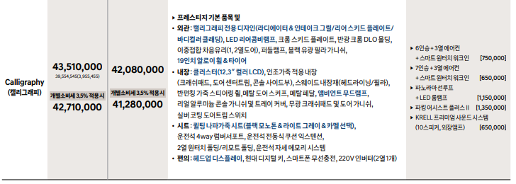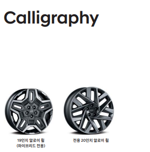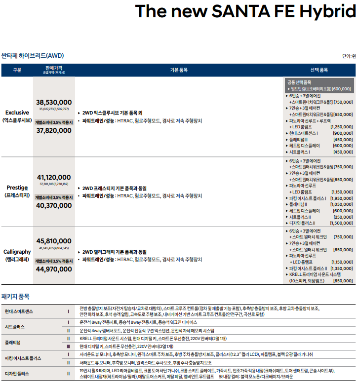 싼타페 하이브리드는 익스클루시브, 프레스티지, 캘리그래피로 총 3가지 트림으로 나누어져 있습니다.