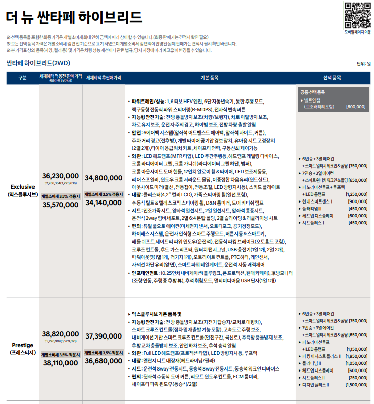 싼타페 하이브리드 익스클루시브 기본 품목 포함